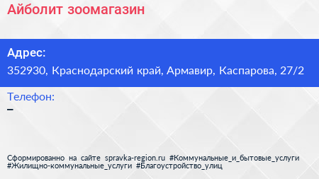 Айболит, зоомагазин по адресу 352930, Краснодарский край, Армавир, Каспарова, 27/2 в дальнейшем Организация, размещена в следующих категориях: