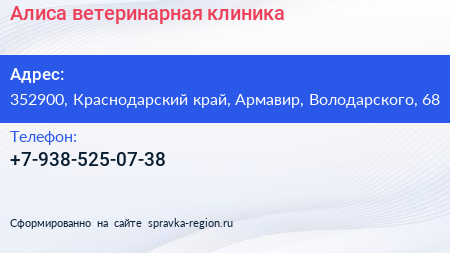 Алиса, ветеринарная клиника по адресу 352900, Краснодарский край, Армавир, Володарского, 68 в дальнейшем Организация, размещена в следующих категориях: