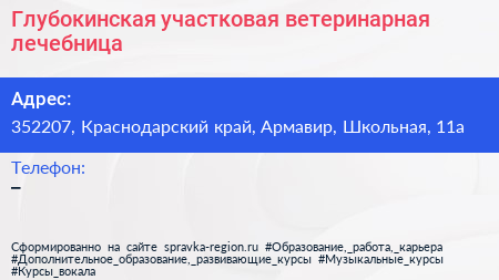 Глубокинская участковая ветеринарная лечебница по адресу 352207, Краснодарский край, Армавир, Школьная, 11а в дальнейшем Организация, размещена в следующих категориях: