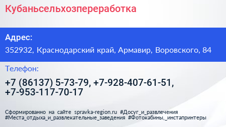 Кубаньсельхозпереработка по адресу 352932, Краснодарский край, Армавир, Воровского, 84 в дальнейшем Организация, размещена в следующих категориях: