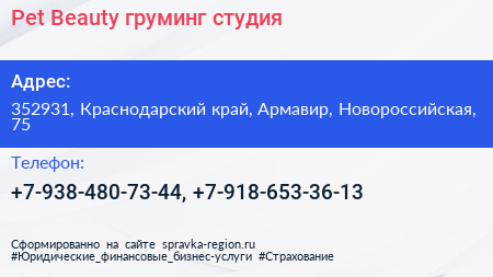 Pet Beauty, груминг-студия по адресу 352931, Краснодарский край, Армавир, Новороссийская, 75 в дальнейшем Организация, размещена в следующих категориях: