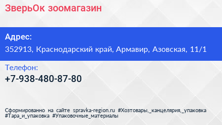 ЗверьОк, зоомагазин по адресу 352913, Краснодарский край, Армавир, Азовская, 11/1 в дальнейшем Организация, размещена в следующих категориях: