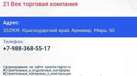 21 Век, торговая компания по адресу 352909, Краснодарский край, Армавир, Мира, 50 в дальнейшем Организация, размещена в следующих категориях: