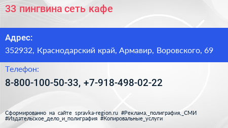 33 пингвина, сеть кафе по адресу 352932, Краснодарский край, Армавир, Воровского, 69 в дальнейшем Организация, размещена в следующих категориях: