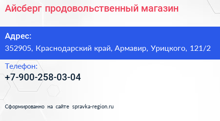 Айсберг, продовольственный магазин по адресу 352905, Краснодарский край, Армавир, Урицкого, 121/2 в дальнейшем Организация, размещена в следующих категориях: