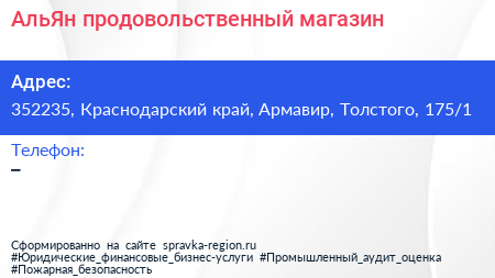 АльЯн, продовольственный магазин по адресу 352235, Краснодарский край, Армавир, Толстого, 175/1 в дальнейшем Организация, размещена в следующих категориях:
