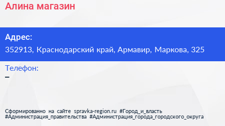 Алина, магазин по адресу 352913, Краснодарский край, Армавир, Маркова, 325 в дальнейшем Организация, размещена в следующих категориях: