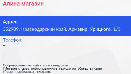 Алина, магазин по адресу 352909, Краснодарский край, Армавир, Урицкого, 1/3 в дальнейшем Организация, размещена в следующих категориях: