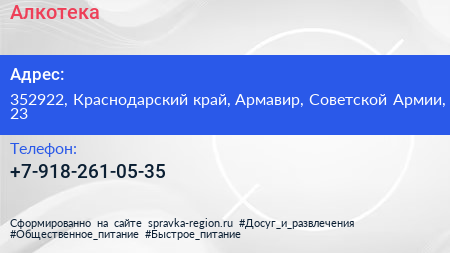 Алкотека по адресу 352922, Краснодарский край, Армавир, Советской Армии, 23 в дальнейшем Организация, размещена в следующих категориях: