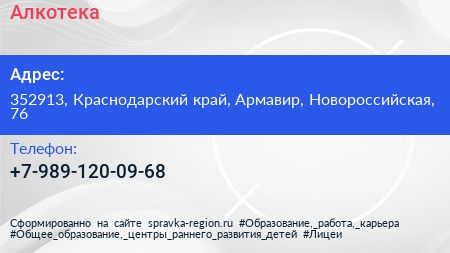 Алкотека по адресу 352913, Краснодарский край, Армавир, Новороссийская, 76 в дальнейшем Организация, размещена в следующих категориях: