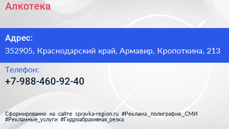 Алкотека по адресу 352905, Краснодарский край, Армавир, Кропоткина, 213 в дальнейшем Организация, размещена в следующих категориях: