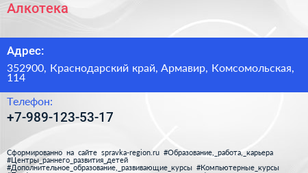 Алкотека по адресу 352900, Краснодарский край, Армавир, Комсомольская, 114 в дальнейшем Организация, размещена в следующих категориях: