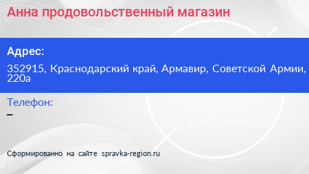 Анна, продовольственный магазин по адресу 352915, Краснодарский край, Армавир, Советской Армии, 220а в дальнейшем Организация, размещена в следующих категориях: