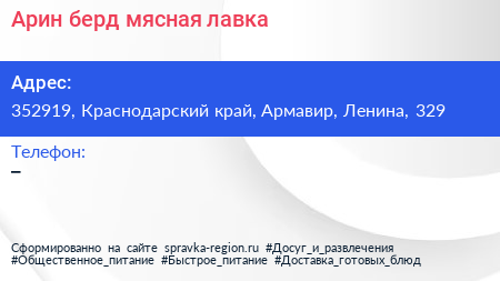 Арин-берд, мясная лавка по адресу 352919, Краснодарский край, Армавир, Ленина, 329 в дальнейшем Организация, размещена в следующих категориях: