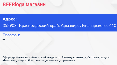 BEERloga, магазин по адресу 352903, Краснодарский край, Армавир, Луначарского, 410 в дальнейшем Организация, размещена в следующих категориях: