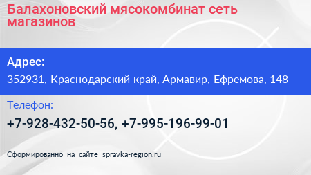 Балахоновский мясокомбинат, сеть магазинов по адресу 352931, Краснодарский край, Армавир, Ефремова, 148 в дальнейшем Организация, размещена в следующих категориях: