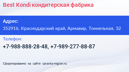 Best Kondi, кондитерская фабрика по адресу 352916, Краснодарский край, Армавир, Тоннельная, 32 в дальнейшем Организация, размещена в следующих категориях: