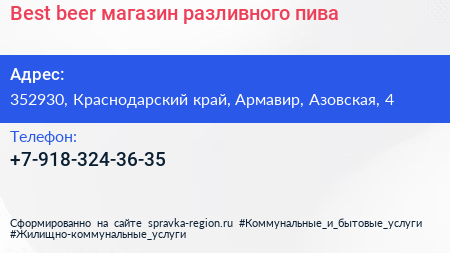 Best beer, магазин разливного пива по адресу 352930, Краснодарский край, Армавир, Азовская, 4 в дальнейшем Организация, размещена в следующих категориях:
