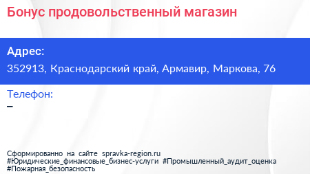 Бонус, продовольственный магазин по адресу 352913, Краснодарский край, Армавир, Маркова, 76 в дальнейшем Организация, размещена в следующих категориях: