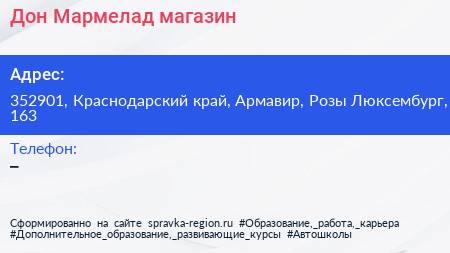 Дон Мармелад, магазин по адресу 352901, Краснодарский край, Армавир, Розы Люксембург, 163 в дальнейшем Организация, размещена в следующих категориях: