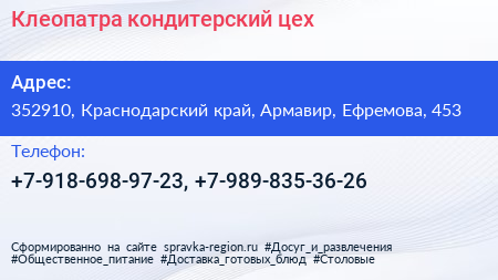 Клеопатра, кондитерский цех по адресу 352910, Краснодарский край, Армавир, Ефремова, 453 в дальнейшем Организация, размещена в следующих категориях: