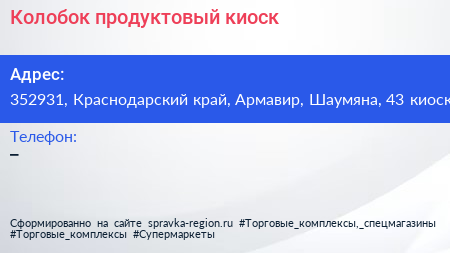 Колобок, продуктовый киоск по адресу 352931, Краснодарский край, Армавир, Шаумяна, 43 киоск в дальнейшем Организация, размещена в следующих категориях: