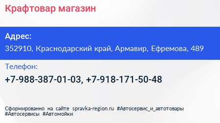Крафтовар, магазин по адресу 352910, Краснодарский край, Армавир, Ефремова, 489 в дальнейшем Организация, размещена в следующих категориях: