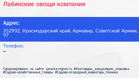 Лабинские овощи, компания по адресу 352932, Краснодарский край, Армавир, Советской Армии, 97 в дальнейшем Организация, размещена в следующих категориях: