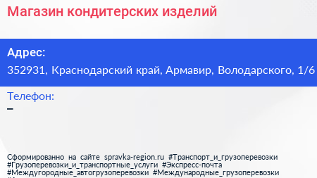 Магазин кондитерских изделий по адресу 352931, Краснодарский край, Армавир, Володарского, 1/6 в дальнейшем Организация, размещена в следующих категориях: