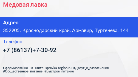 Медовая лавка по адресу 352905, Краснодарский край, Армавир, Тургенева, 144 в дальнейшем Организация, размещена в следующих категориях: