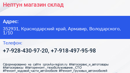 Нептун, магазин-склад по адресу 352931, Краснодарский край, Армавир, Володарского, 1/10 в дальнейшем Организация, размещена в следующих категориях: