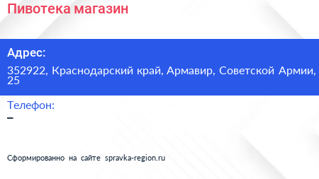 Пивотека, магазин по адресу 352922, Краснодарский край, Армавир, Советской Армии, 25 в дальнейшем Организация, размещена в следующих категориях: