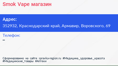 Smok & Vape, магазин по адресу 352932, Краснодарский край, Армавир, Воровского, 69 в дальнейшем Организация, размещена в следующих категориях: