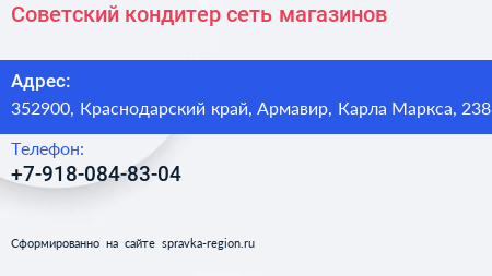 Советский кондитер, сеть магазинов по адресу 352900, Краснодарский край, Армавир, Карла Маркса, 238 в дальнейшем Организация, размещена в следующих категориях: