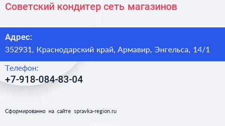 Советский кондитер, сеть магазинов по адресу 352931, Краснодарский край, Армавир, Энгельса, 14/1 в дальнейшем Организация, размещена в следующих категориях: