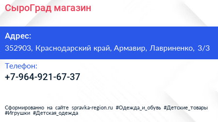 СыроГрад, магазин по адресу 352903, Краснодарский край, Армавир, Лавриненко, 3/3 в дальнейшем Организация, размещена в следующих категориях: