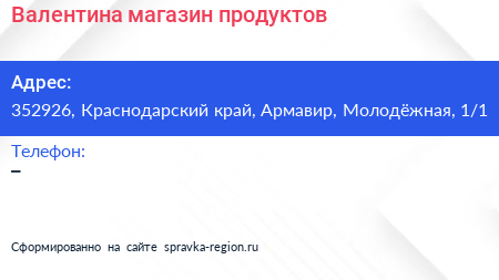 Валентина, магазин продуктов по адресу 352926, Краснодарский край, Армавир, Молодёжная, 1/1 в дальнейшем Организация, размещена в следующих категориях: