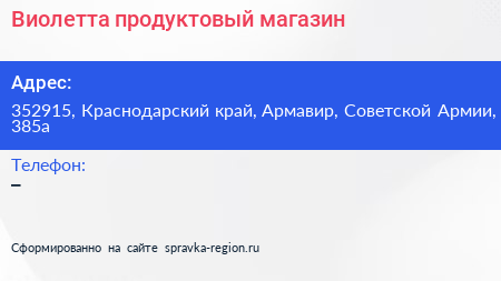Виолетта, продуктовый магазин по адресу 352915, Краснодарский край, Армавир, Советской Армии, 385а в дальнейшем Организация, размещена в следующих категориях: