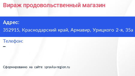 Вираж, продовольственный магазин по адресу 352915, Краснодарский край, Армавир, Урицкого 2-я, 35а в дальнейшем Организация, размещена в следующих категориях: