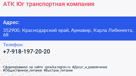 АТК-Юг, транспортная компания по адресу 352900, Краснодарский край, Армавир, Карла Либкнехта, 68 в дальнейшем Организация, размещена в следующих категориях: