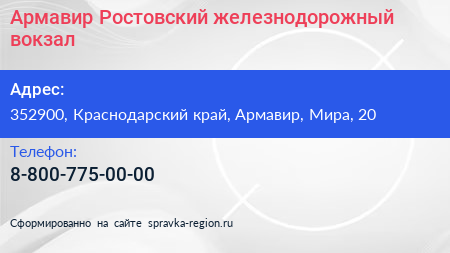 Армавир-Ростовский, железнодорожный вокзал по адресу 352900, Краснодарский край, Армавир, Мира, 20 в дальнейшем Организация, размещена в следующих категориях: