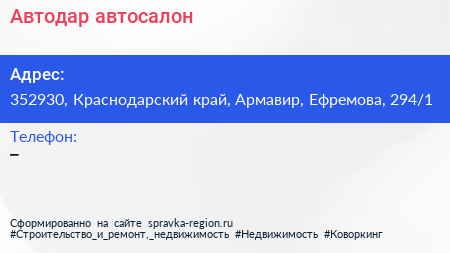 Автодар, автосалон по адресу 352930, Краснодарский край, Армавир, Ефремова, 294/1 в дальнейшем Организация, размещена в следующих категориях: