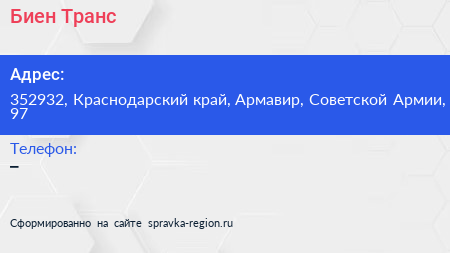 Биен Транс по адресу 352932, Краснодарский край, Армавир, Советской Армии, 97 в дальнейшем Организация, размещена в следующих категориях:
