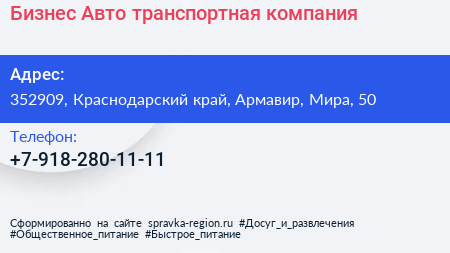 Бизнес Авто, транспортная компания по адресу 352909, Краснодарский край, Армавир, Мира, 50 в дальнейшем Организация, размещена в следующих категориях: