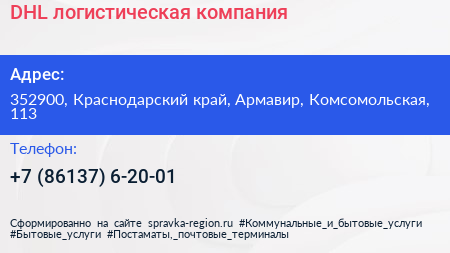 DHL, логистическая компания по адресу 352900, Краснодарский край, Армавир, Комсомольская, 113 в дальнейшем Организация, размещена в следующих категориях: