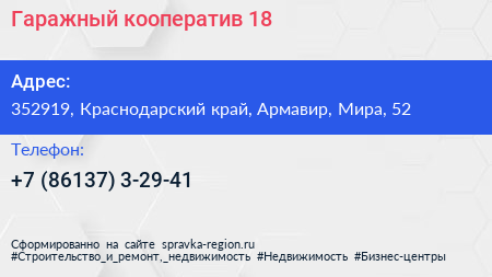 Гаражный кооператив №18 по адресу 352919, Краснодарский край, Армавир, Мира, 52 в дальнейшем Организация, размещена в следующих категориях: