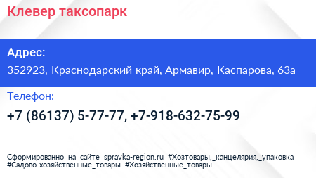 Клевер, таксопарк по адресу 352923, Краснодарский край, Армавир, Каспарова, 63а в дальнейшем Организация, размещена в следующих категориях: