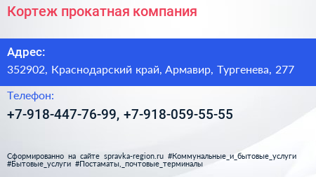 Кортеж, прокатная компания по адресу 352902, Краснодарский край, Армавир, Тургенева, 277 в дальнейшем Организация, размещена в следующих категориях: