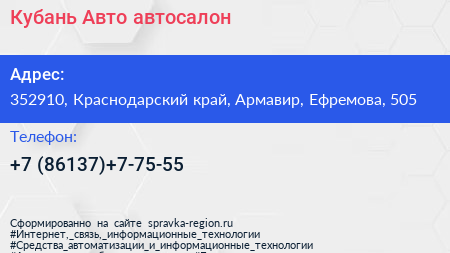 Кубань Авто, автосалон по адресу 352910, Краснодарский край, Армавир, Ефремова, 505 в дальнейшем Организация, размещена в следующих категориях: