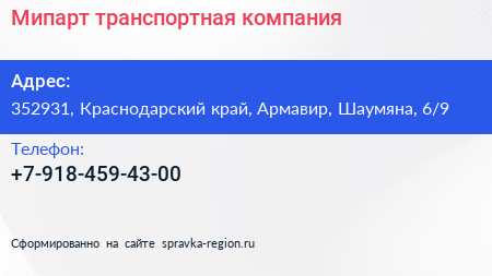 Мипарт, транспортная компания по адресу 352931, Краснодарский край, Армавир, Шаумяна, 6/9 в дальнейшем Организация, размещена в следующих категориях: